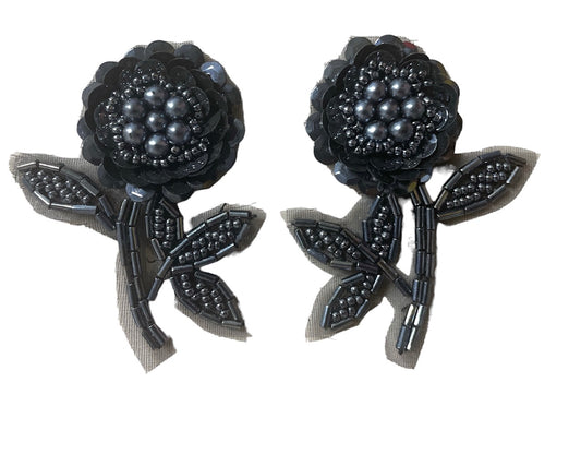 Black Sequin Beaded Flower Pair 6.5" X 6"