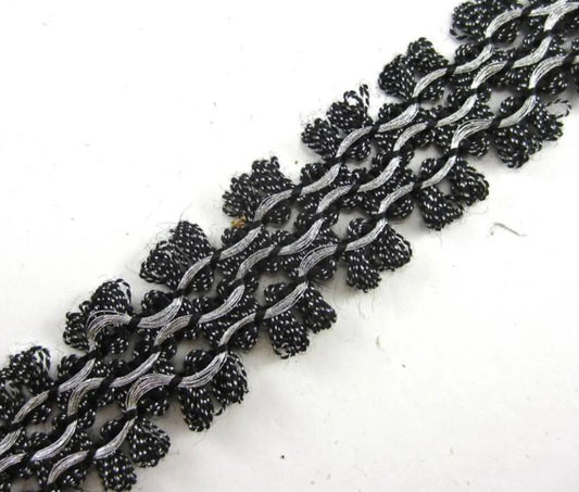 Trim with Black Rope Intertwined with Metallic Silver Thread 1" Wide, Sold by the Yard