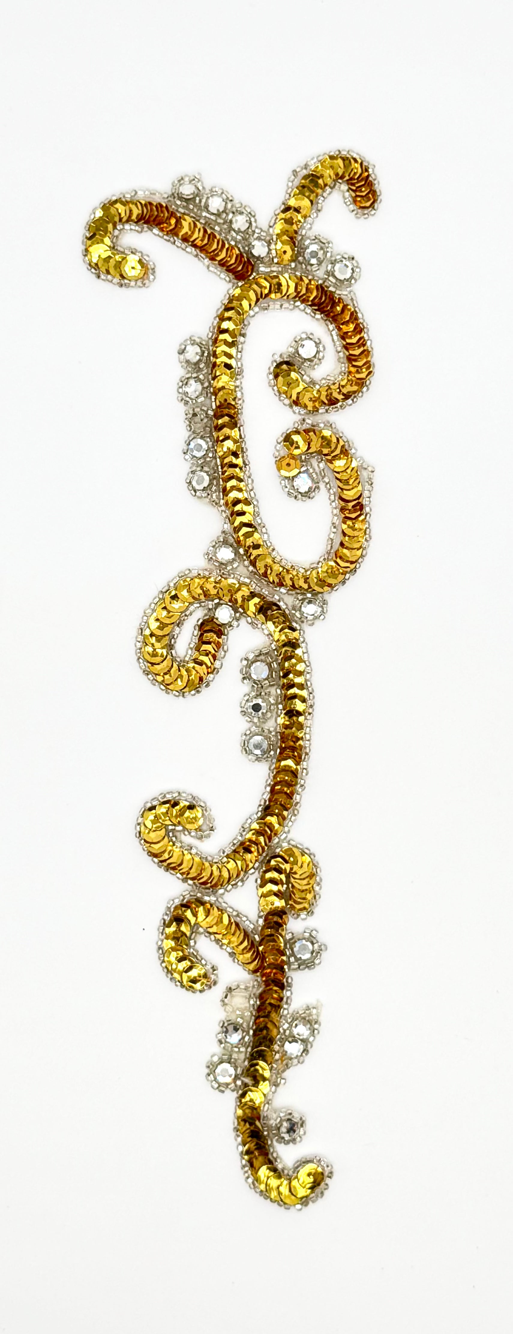 Vintage Designer Motif with Bright Gold Sequins and 25 Rhinestones 10" x 3”