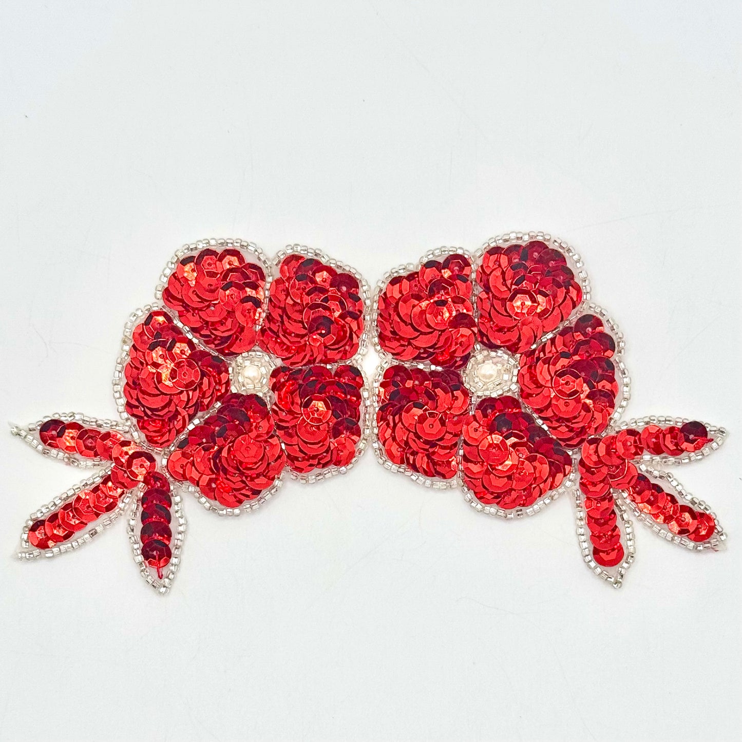 Add some sparkle to your life with our Flower Appliqué! Featuring vibrant red sequins and elegant silver beads, this 6" x 3" piece also has a beautiful center pearl. Perfect for adding a unique touch to clothing, accessories, or home decor. Shine on with this quirky and playful addition!