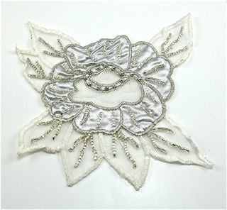 Vintage Flower Embroidered White with Silver Beads 5.6" x 6.5"
