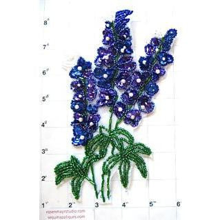 Transform any outfit with this Beautiful Handmade Bluebonnet Triple Flower Appliqué. The vibrant Royal Blue and Purple Sequins, Green purple and blue beads, and pearls in the center of the flowers add a touch of whimsy and elegance. Measuring 7.5" x 5.5", it's the perfect accessory for any occasion.