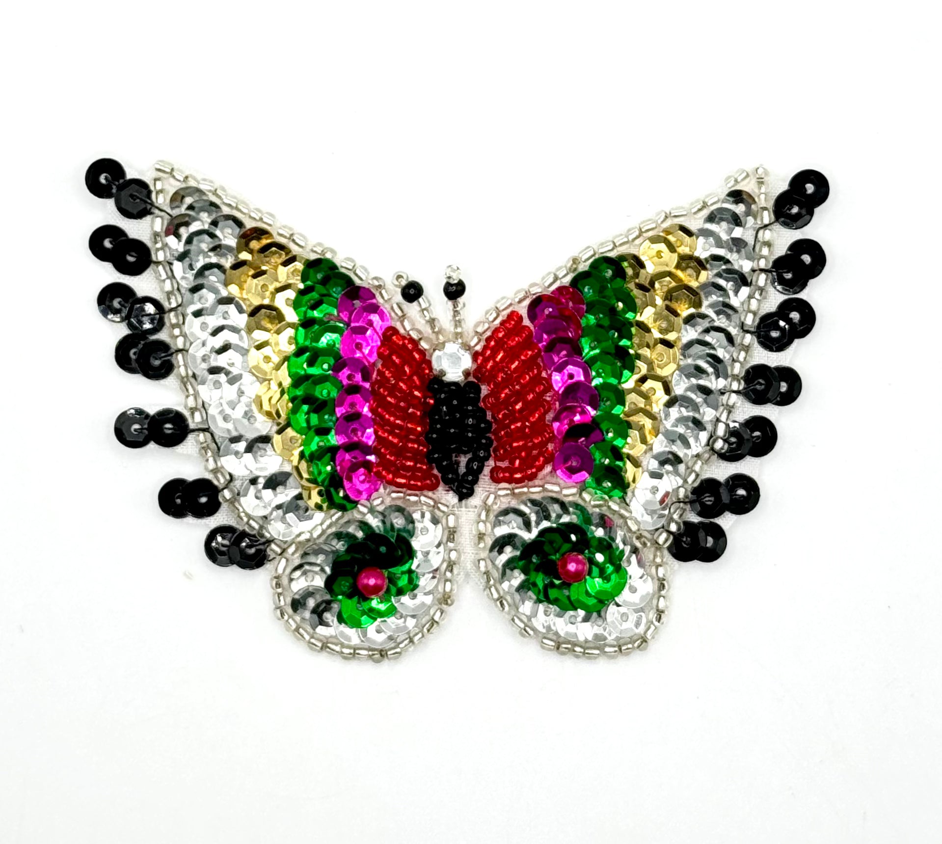 Add a touch of whimsy with this colorful, sparkly butterfly appliqué featuring a mix of silver, gold, green, fuchsia, red, and black sequins, as well as silver, black, and red beads with a sparkling rhinestone. It measures 3.75” x 2.5” and is sure to make any outfit stand out.