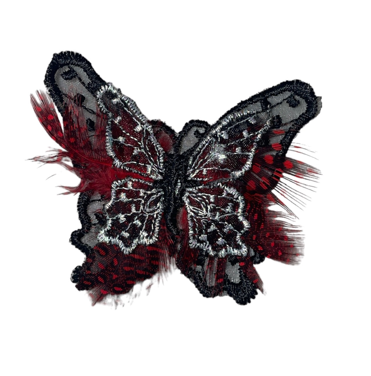 Butterfly Embroidered Black and Red Feathers 2" x 2.5"