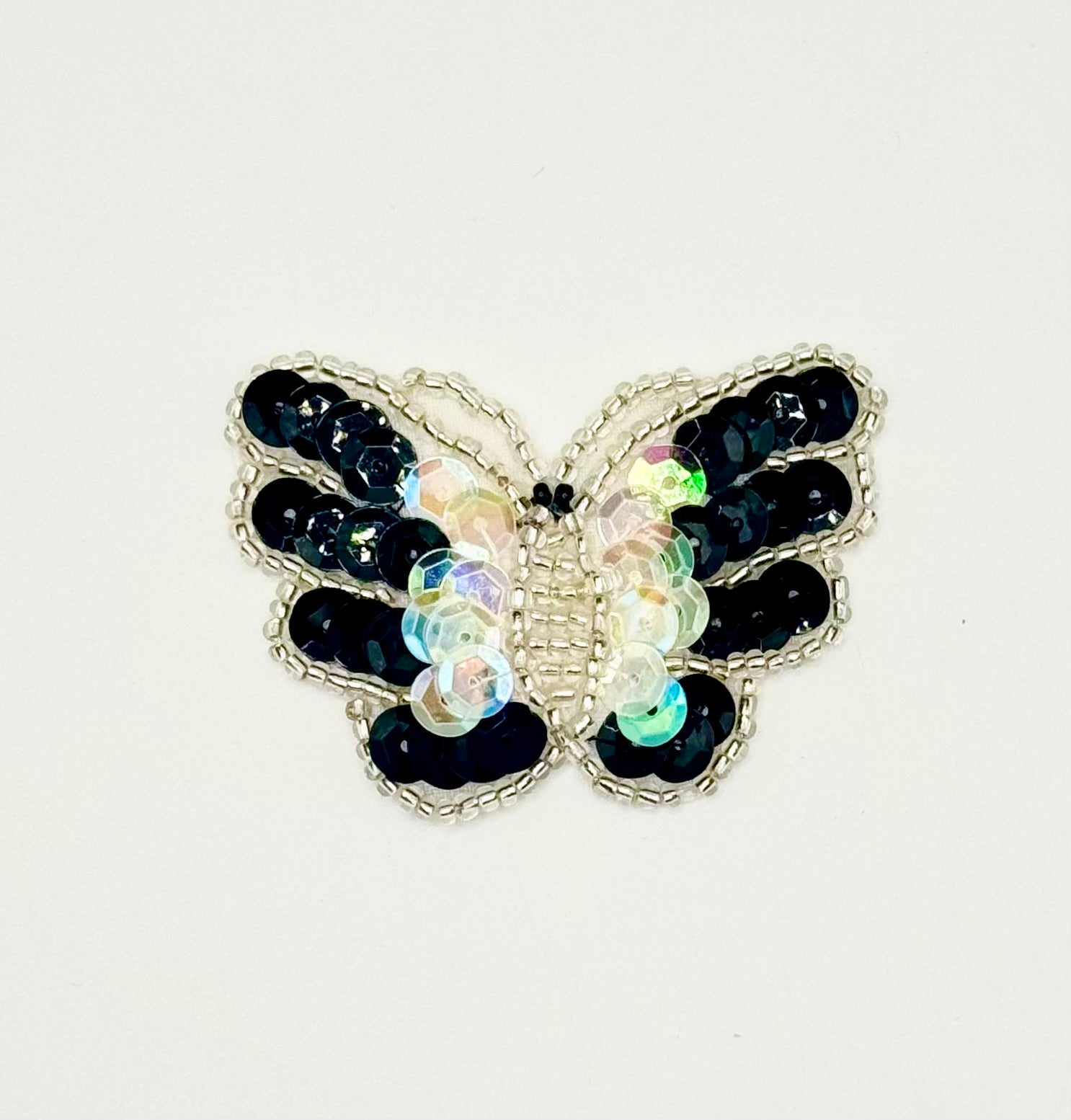 Butterfly Appliqué with Clear Iridescent and Black Sequins and Silver Beads 2.25" x 1.5"