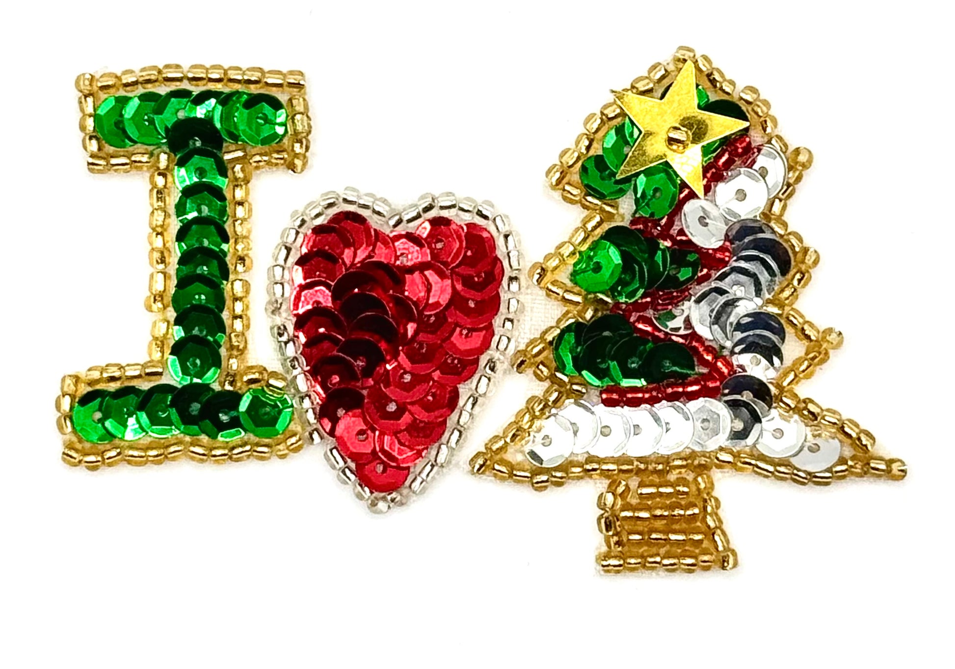 Expertly handcrafted, this Christmas appliqué features the symbol for "I Love Christmas" in a compact 1.5" x 3" size. Made with care and skill, it adds a personal touch to your holiday decor. Show your love for the season with this unique piece.