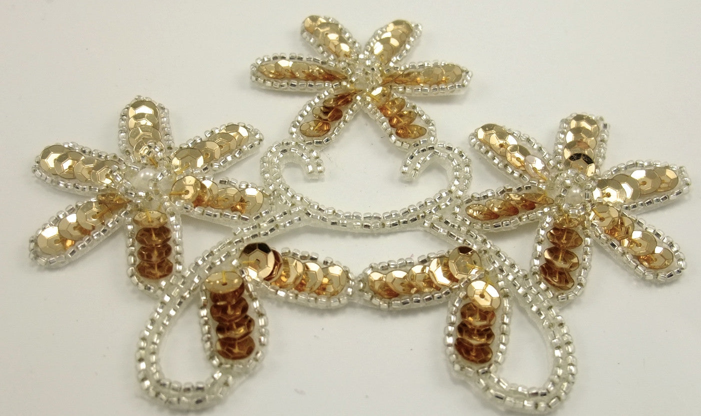 Triple Flower with Gold Sequins, Silver Beads and Pearl Pearl 5" x 4" Choice of Spotlight Gold or Regular Gold