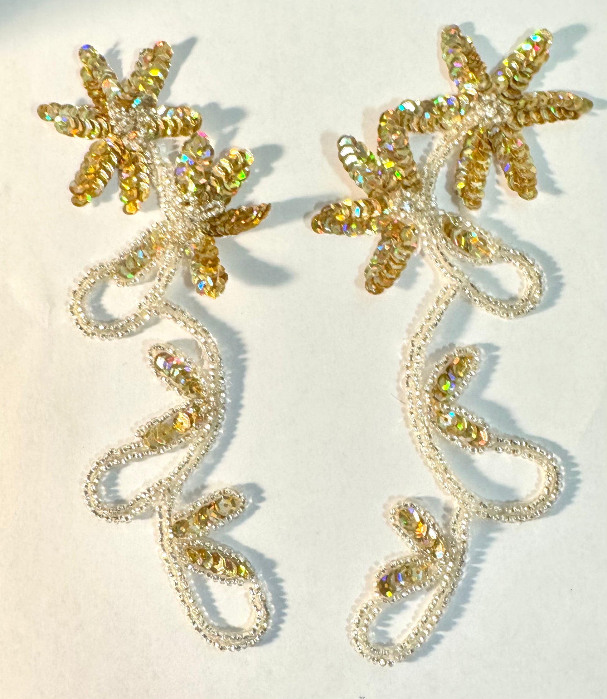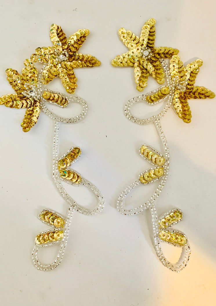 Flower Pair with Gold Laser Sequins and Silver Beads and Rhinestones 8" x 3"