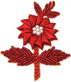 Flower Red Satin with Red Beads and Pearls 3" x 4"