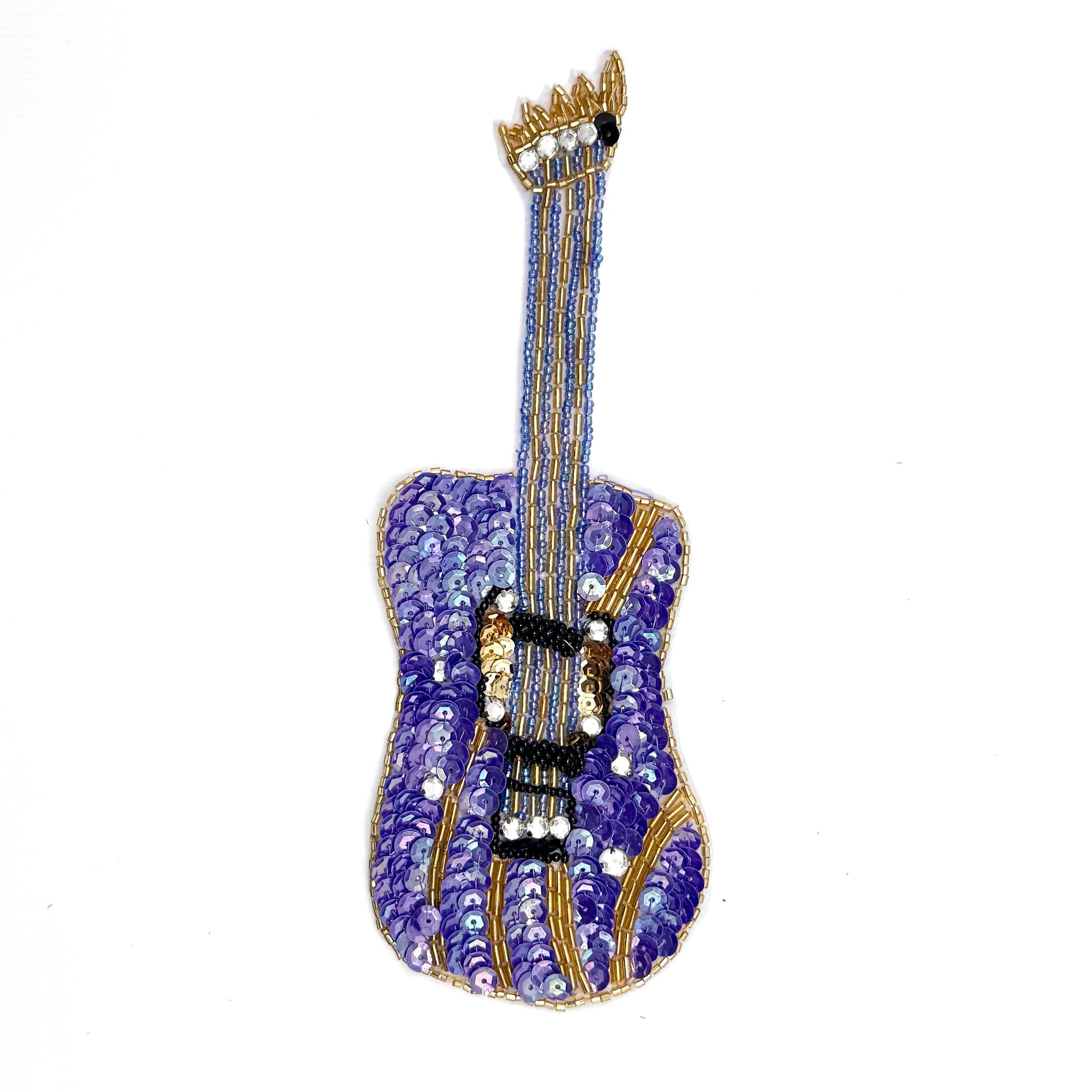 Handmade Guitar Appliqué with Purple Sequins and Beads 8.5" x 3"