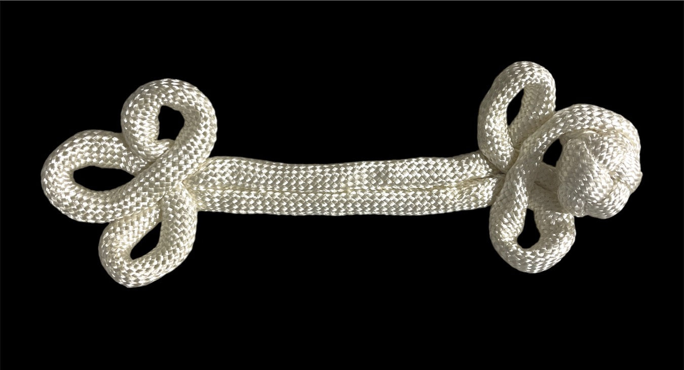 LONG WHITE FROG CLOSURE WITH THE CLOSURE ON THE RIGHT SIDE.