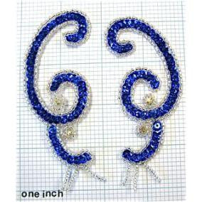 Designer Motif Pair with Royal Blue Lazer Sequins , Silver Beads and Rhinestones 4" x 2"