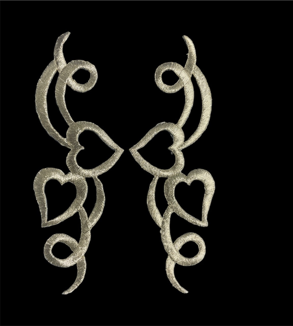 Designer Motif Heart Pair, Metallic Silver Embroidered Iron-on 5.25" x 1.5" (sized each)