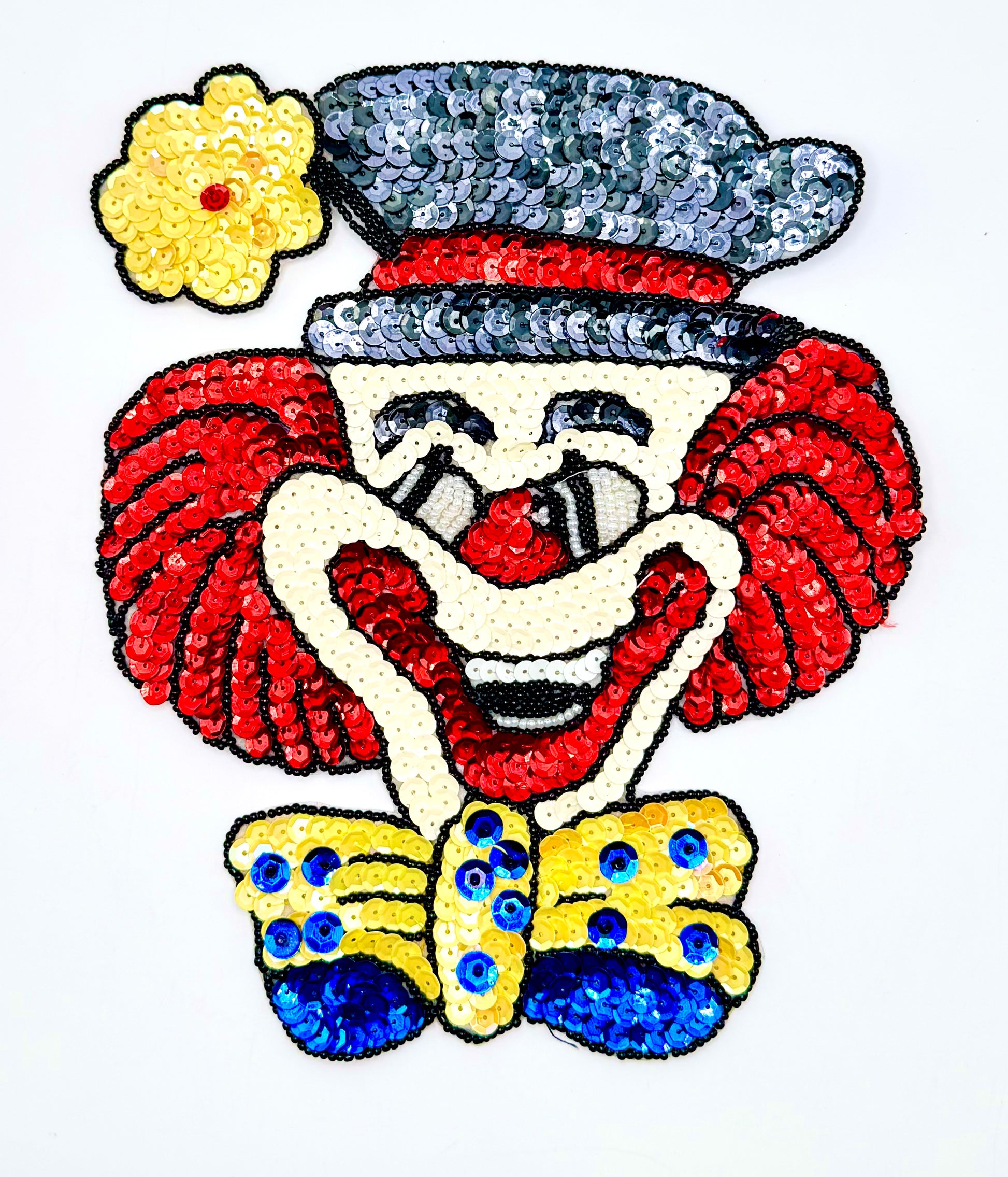 Clown with a Bow and Hat with a Flower. Iridescent Yellow, Gray, Red, Black, White and Royal Blue Sequins - Black, Red, White and Royal Blue Beads - 9” x 7.25”