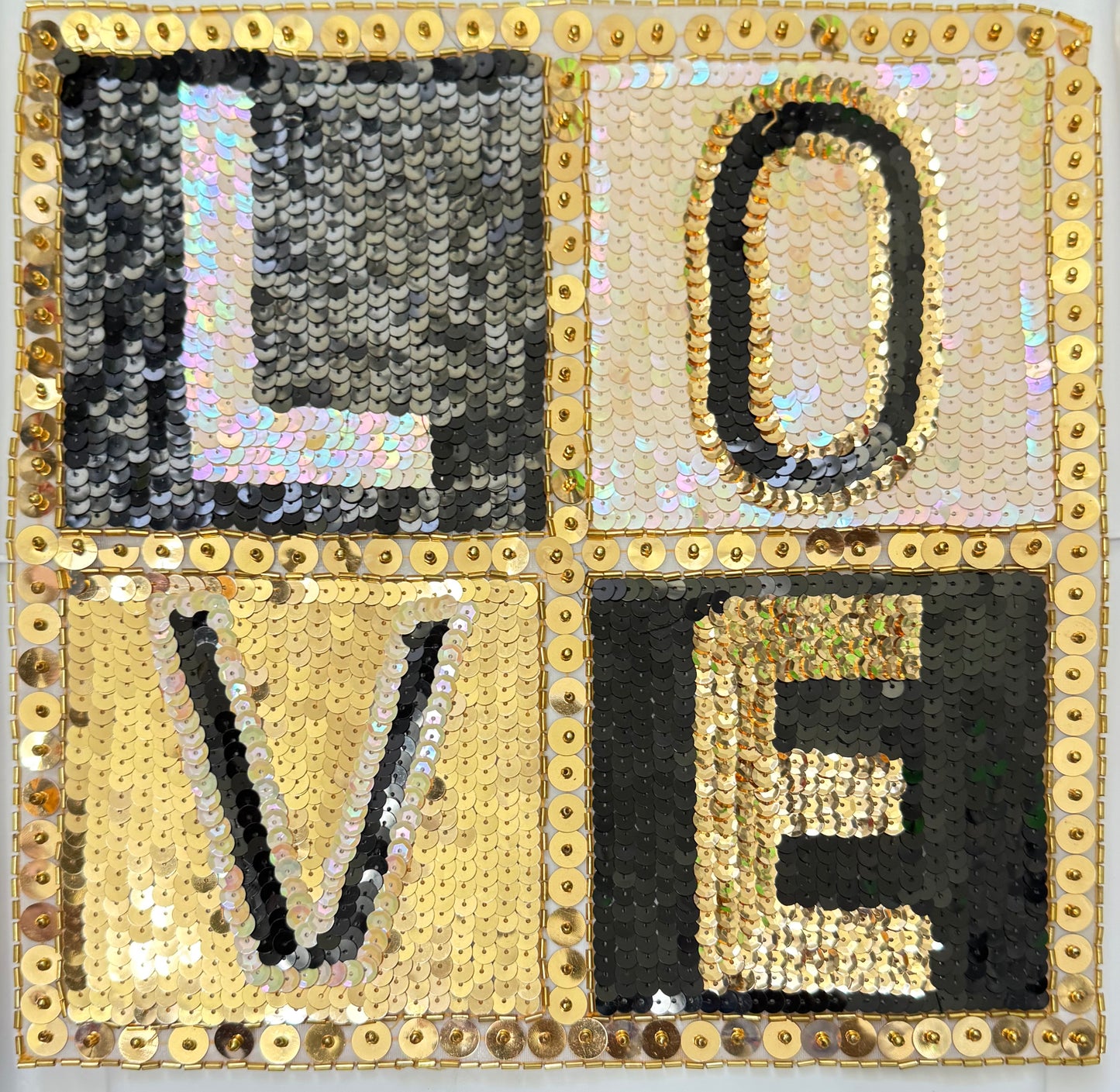 "LOVE" word patch with Gold/Black Sequins and Beads 10" x 10"