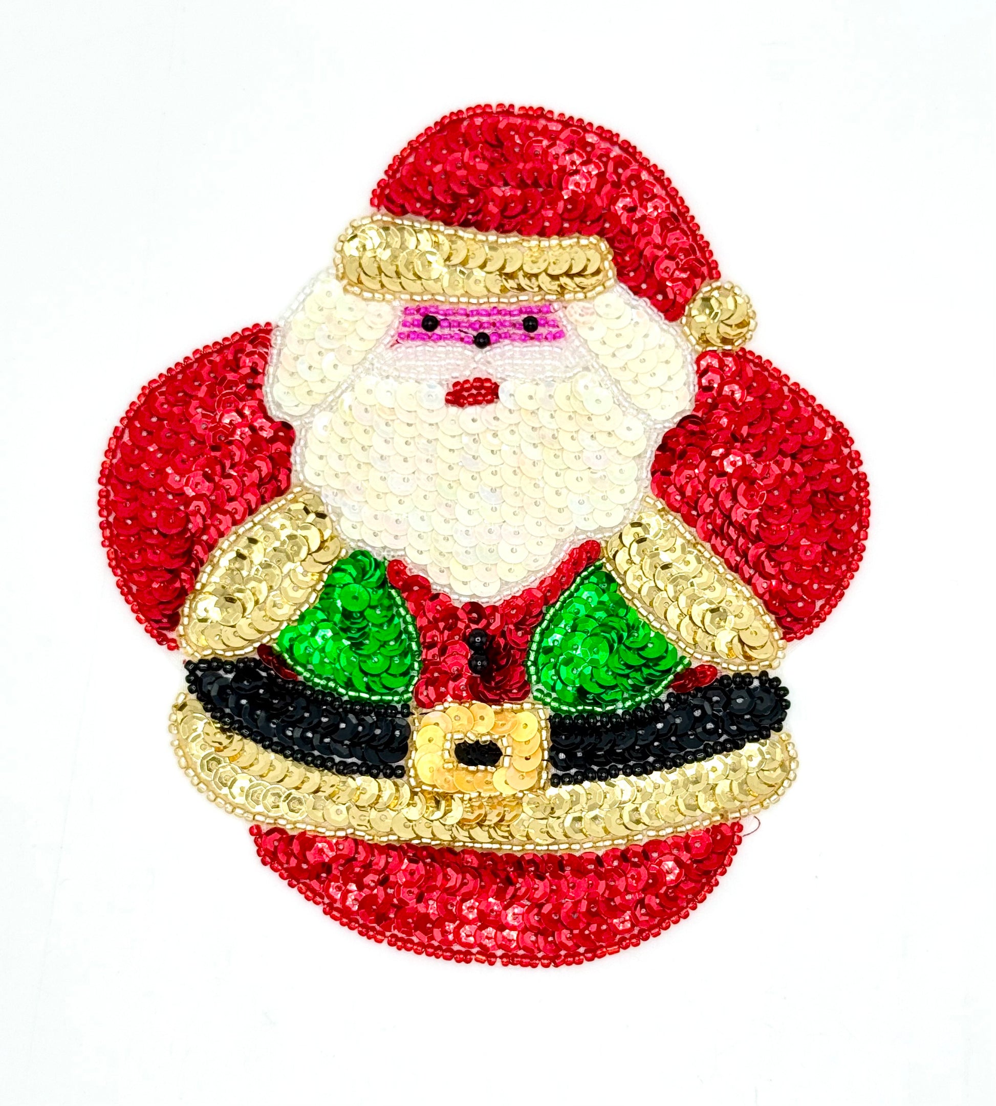 Santa with Colorful Sequins and Beads - Red, Iridescent White, Green, Gold and Black Sequins - Red, Gold, Black, White, Green and Pink Glass Beads - 5.75" x 5.25"