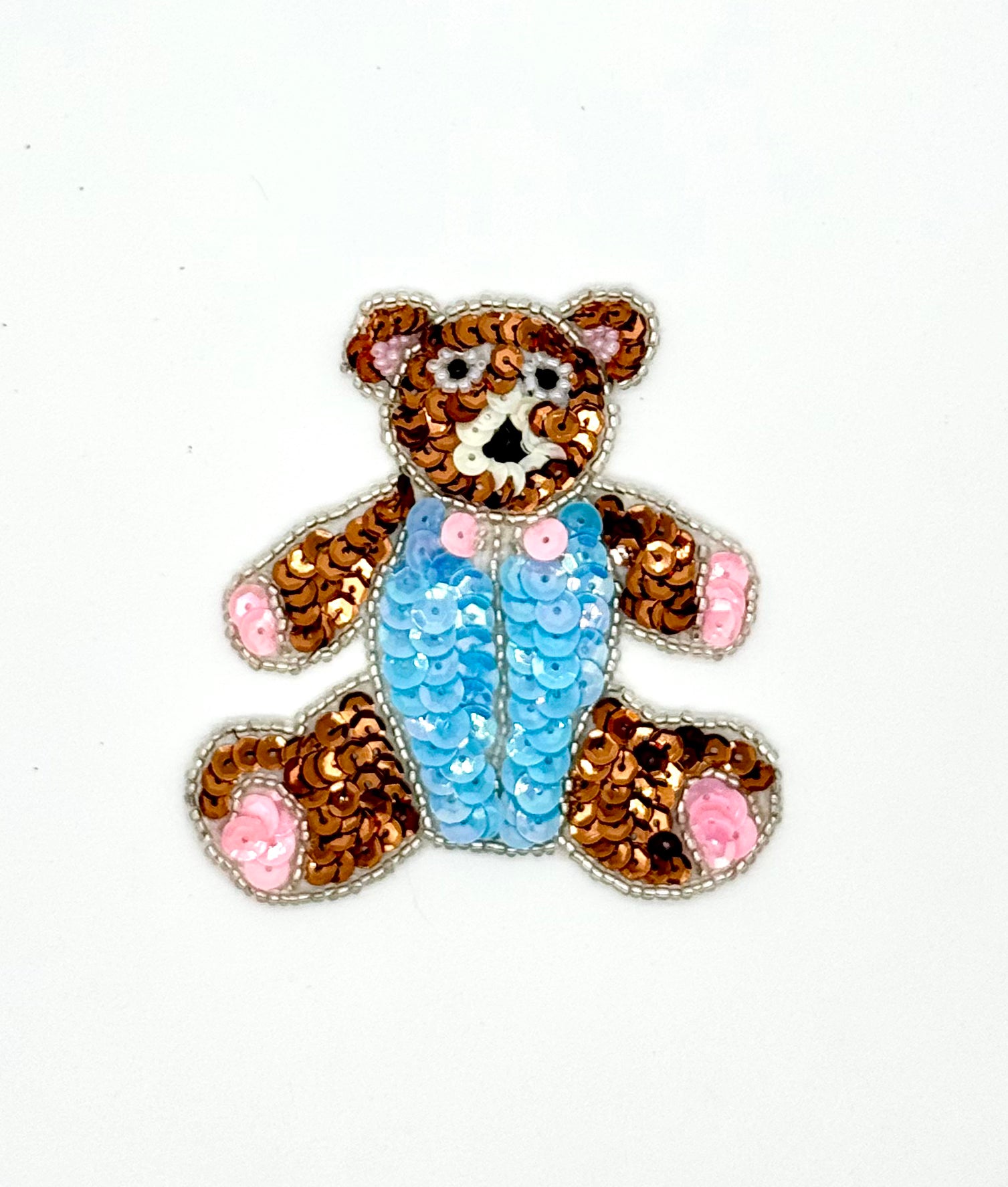 Teddy Bear with Pink, Bronze, Cream and Light Blue Sequins and Silver, Black, Pink and Black Beads 3.5" x 3.25”